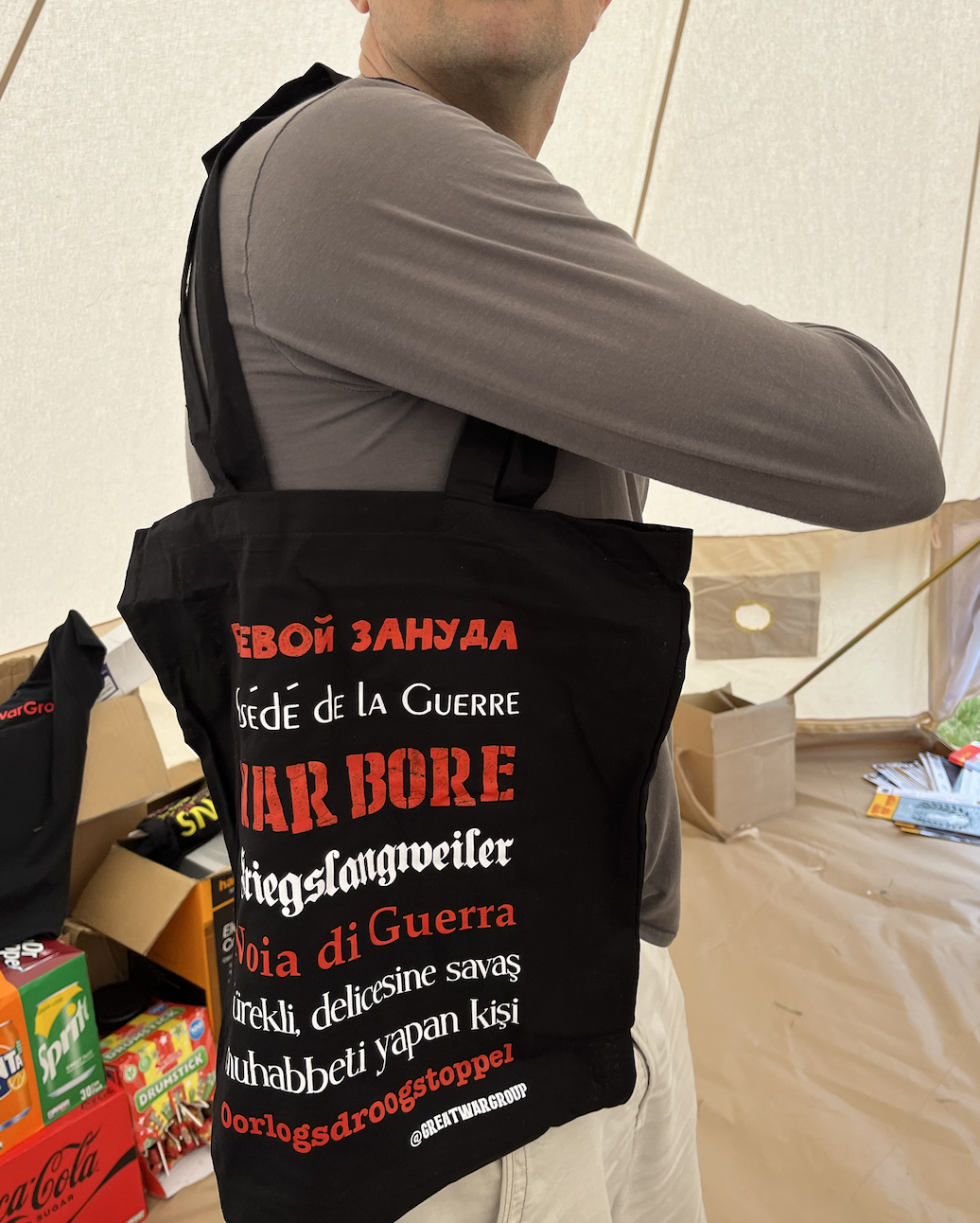 Carry your war books in style with this Great War Group tote bag.   Features variants of "war bore" in Russian, French, English, German, Italian, Turkish and Flemish.   100% Cotton, black